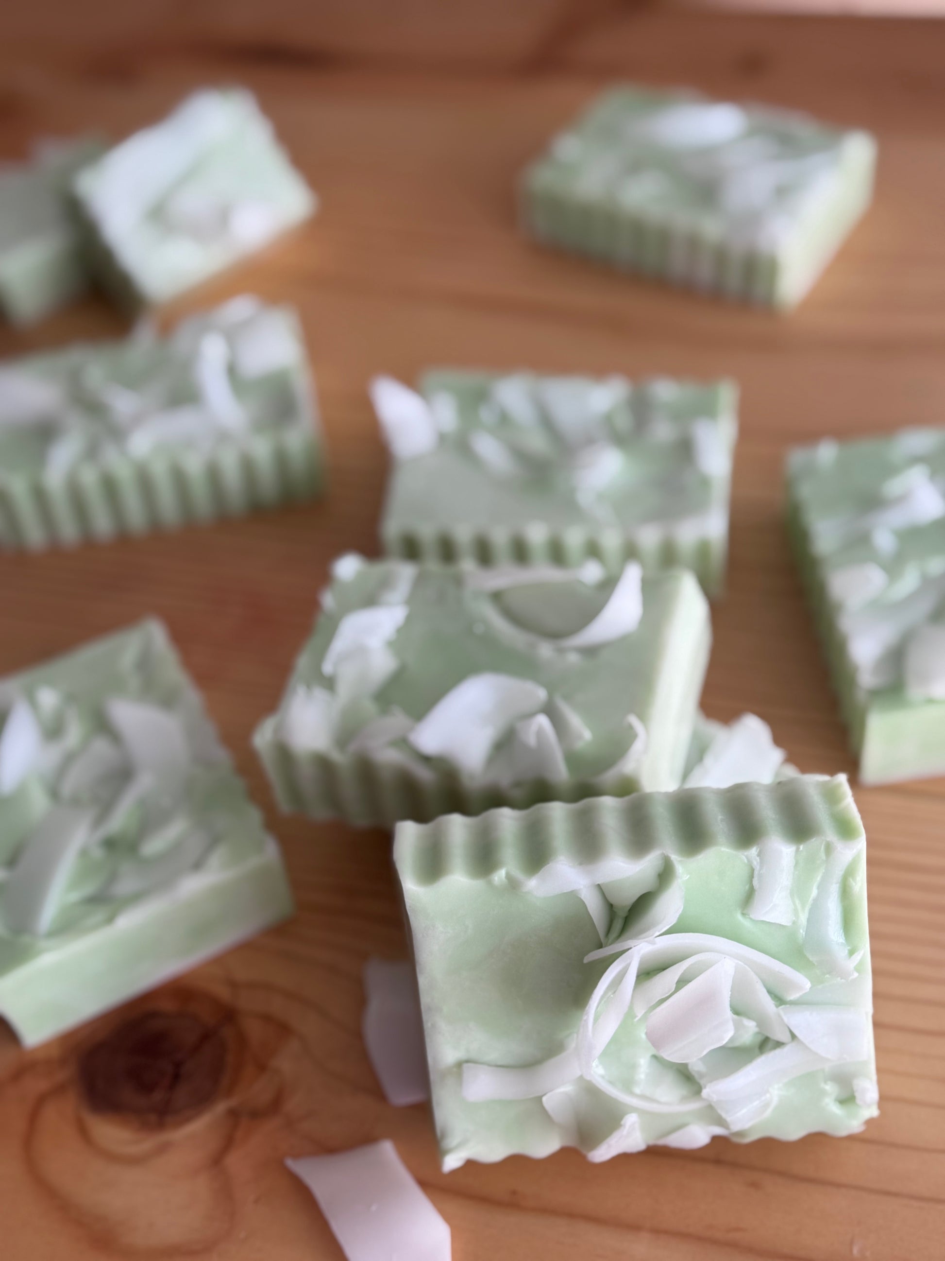 INGREDIENTS: shea butter soap base, goat’s milk soap base shreds, French green clay, sweet almond oil, essential oil blend (lime, coconut, sandalwood), mica powder